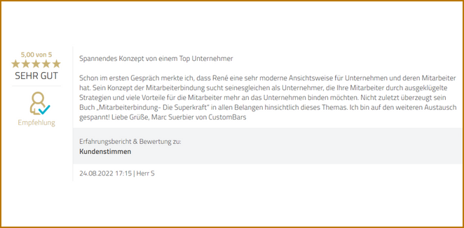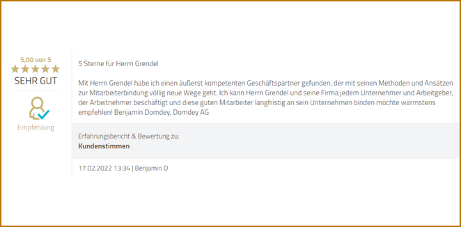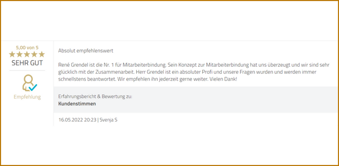 Durch René Grendels Mentoringprogramm haben wir Einblicke in effektive Lösungen für Lohnerhöhung und Mitarbeitergespräche gewonnen. So steigerten wir die Mitarbeiterzufriedenheit sowie Mitarbeiterbindung und bleiben als Unternehmen attraktiv, während wir gleichzeitig Kosten kontrollieren. Der Mitarbeitermagnet war eine kluge Entscheidung mit nachhaltigem Erfolg.